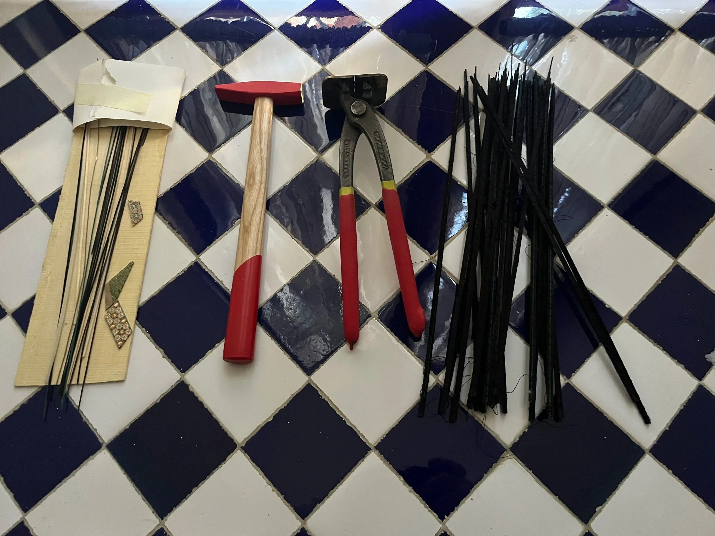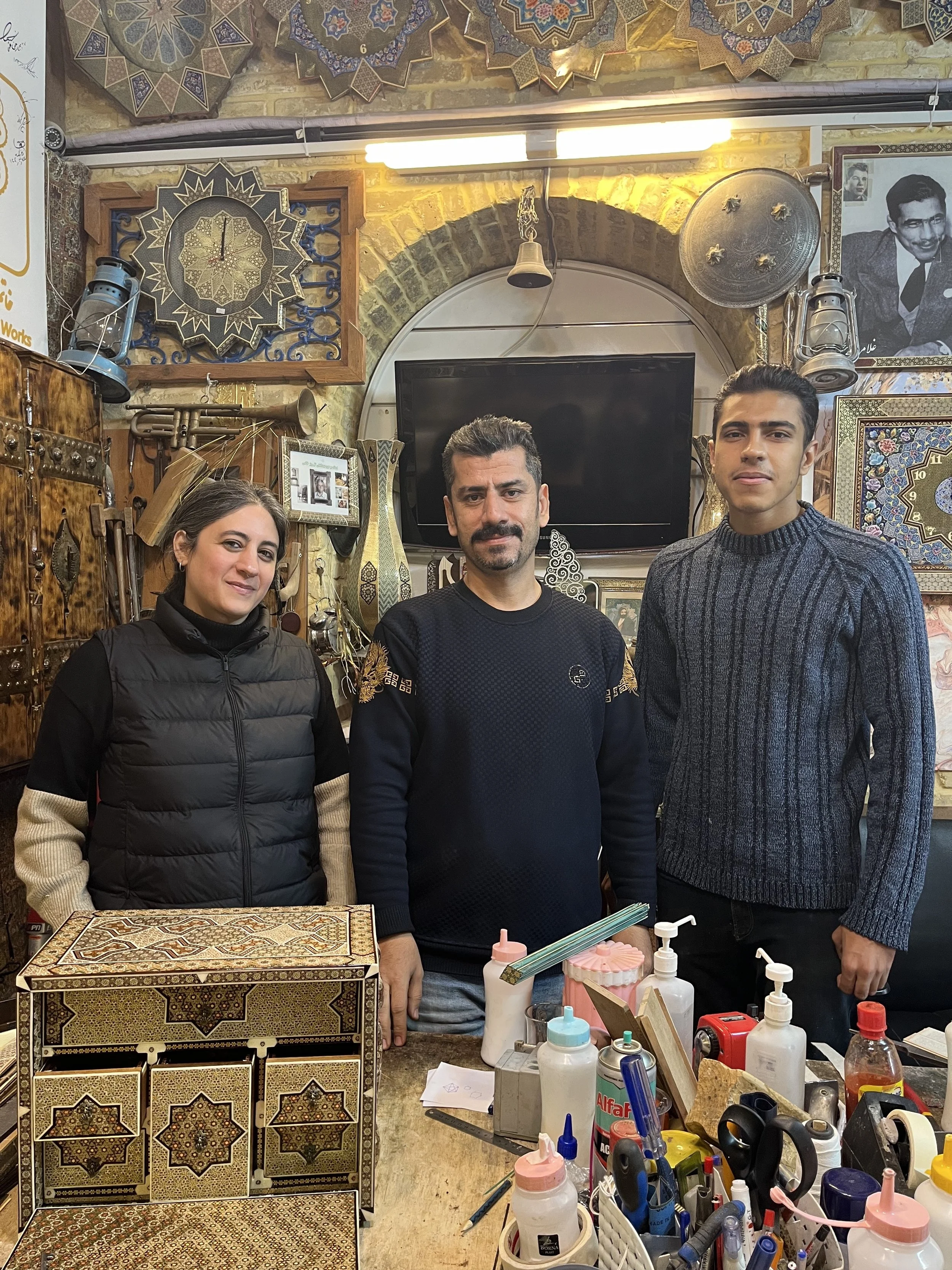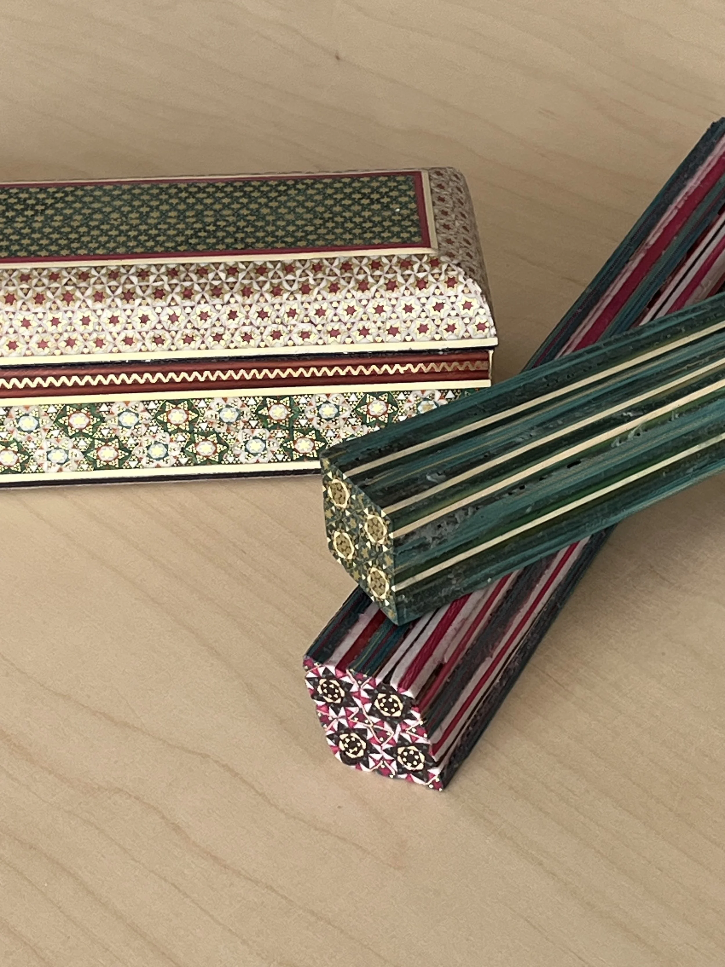 In December 2024, I traveled to Shiraz, Iran, for a six-week apprenticeship in Khatam making — a traditional Iranian wood inlay technique that uses wood, bone, and metal to form miniature geometric patterns. This craft holds deep personal significance: my grandfather was a master of Khatam, and though he passed before I could learn from him, I was able to connect with descendants of his peers. There, I immersed myself in every stage of the process — from material selection, coloring, and gluing to pattern design and its symbolic and cultural meanings — and began to think about how to reinterpret the craft in my own practice.