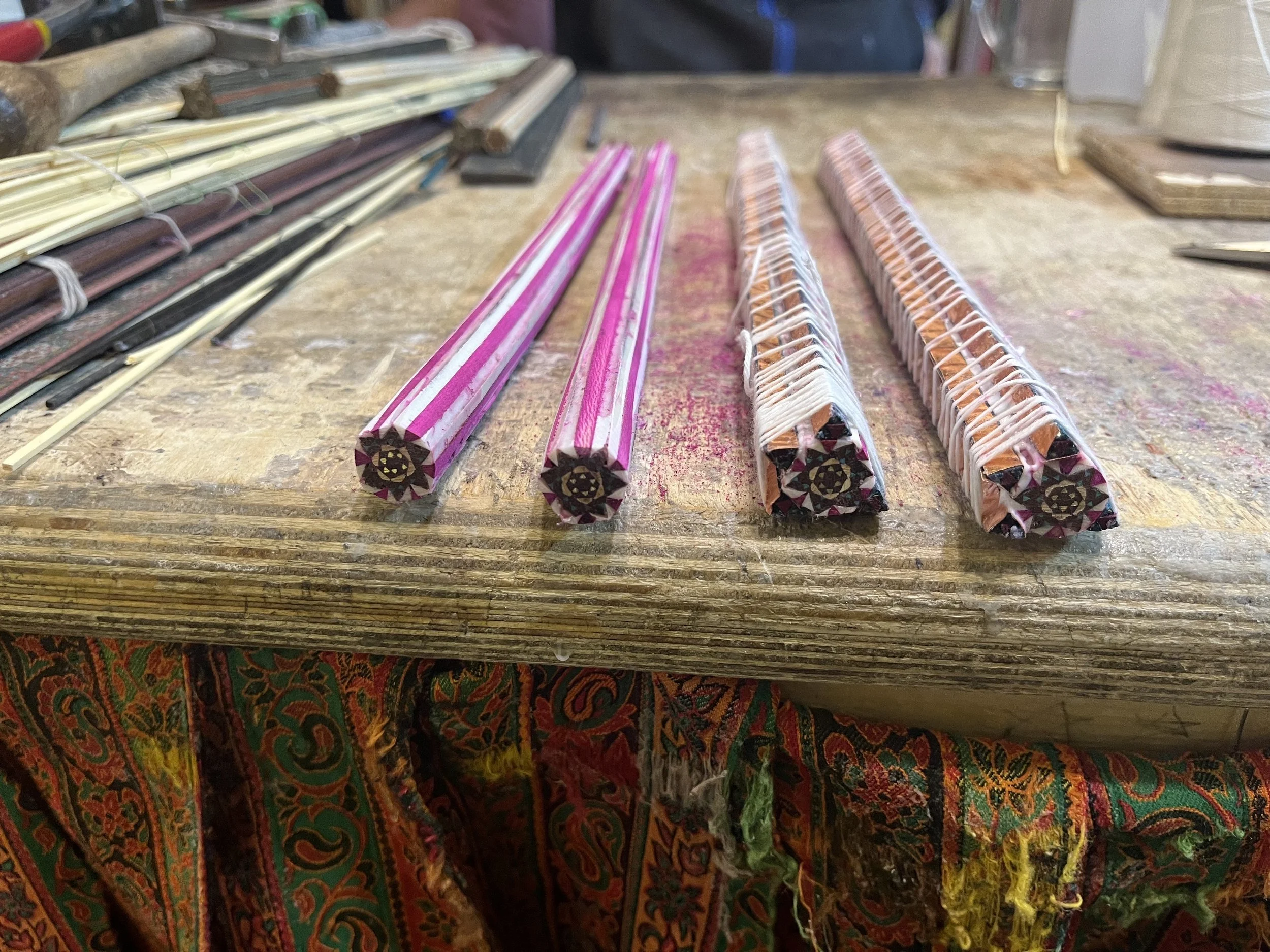 Khatam is unique in how it unites different materials — wood, brass, bone, ivory — into patterns built from repeated triangles, much like pointillism in painting or woven textile structures. It parallels my experience in weaving, woodworking, and dyeing, both in its technical complexity and in the narrative embedded within its structure.